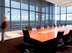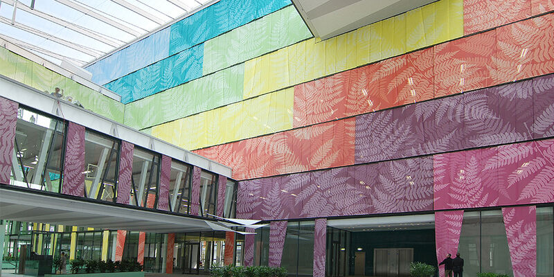 Das Gewebe SV 10% ausgewählt, um die 1031 bedruckten Schiebevorhänge zu überziehen, d.h. mehr als 12.000 m² Stoff, der die vertikalen Glasfassaden abdeckt.