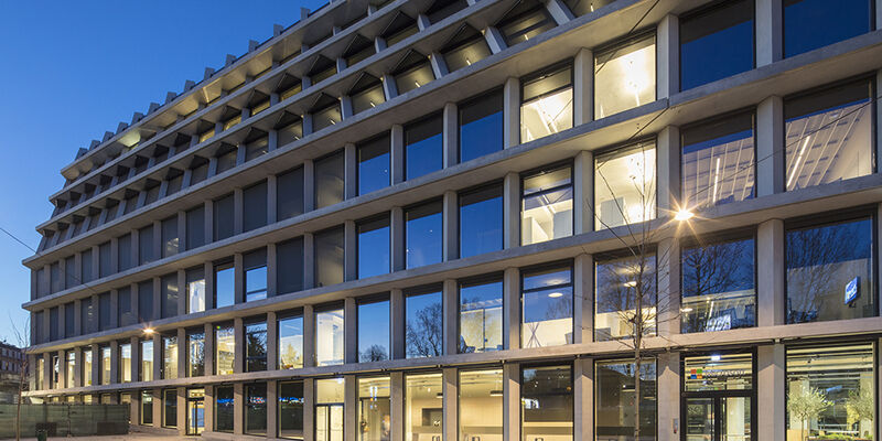 320 ZIP-Rollos aus Satiné 5500-Gewebe im Farbton 0130 Grau Charcoal, das sind 6.000 m², auf der Südfassade angebracht, und zwar: