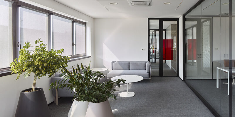 - ZIP-Innenrollos mit dem Gewebe Kibo 8500 im Farbton 3030 Charcoal für eine vollständige Verdunkelung. Das Auditorium ist ausgestattet mit einem Doppelrollo-System: mit dem Gewebe M-Screen 8505, um direktes Sonnenlicht zu reduzieren und mit dem Gewebe Kibo 8500, um eine vollständige Verdunkelung des Raumes zu gewährleisten.