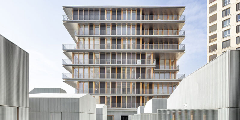Stores à enroulement extérieurs avec le tissu Satiné 5500 coloris 0606 Bronze pour des logements collectifs.