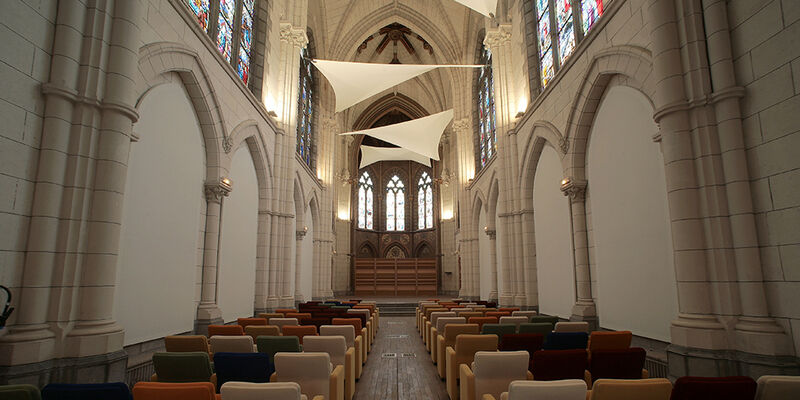- Für den Saal: Bewahrung des architektonischen Ansicht der Kapelle. Das Anbringen von Geweben verfälscht sie nicht und verbirgt auch nicht das Traggerüst des Kirchenschiffs vor den Blicken der Besucher.